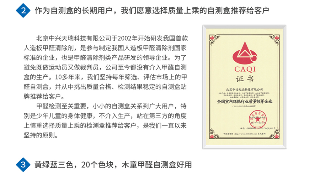 北京中興天瑞科技有限公司于2006年成為中國(guó)檢疫檢驗(yàn)科學(xué)研究院出品的甲醛自測(cè)盒的用戶,檢疫研究院甲醛自測(cè)盒停產(chǎn)之后,經(jīng)過(guò)對(duì)多種自測(cè)盒檢測(cè)效果的比對(duì),開(kāi)始使用檢測(cè)結(jié)果準(zhǔn)確穩(wěn)定的蘭康保甲醛自測(cè)盒。在10多年的使用過(guò)程中,不斷向廠家提出改進(jìn)意見(jiàn),2016年在我們的建議下,把比色卡由8個(gè)色條,改為20個(gè)色塊,使得檢測(cè)結(jié)果分的更加細(xì)致,更便于消費(fèi)者使用。