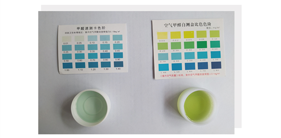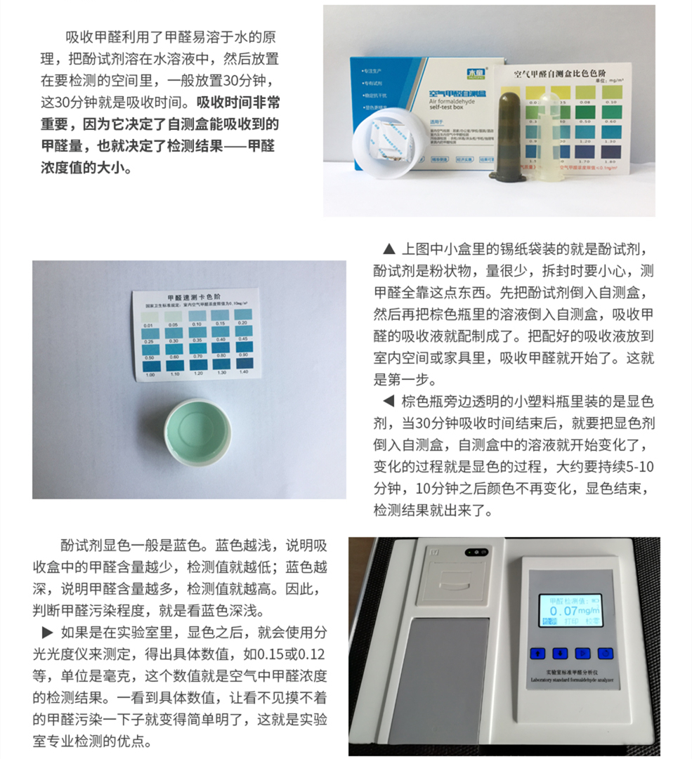 2、自測(cè)盒測(cè)甲醛分兩步:第一步是吸收甲醛;第二步是顯色、比色,辨識(shí)甲醛含量