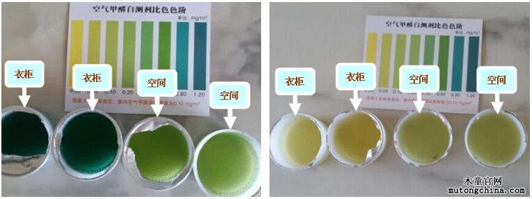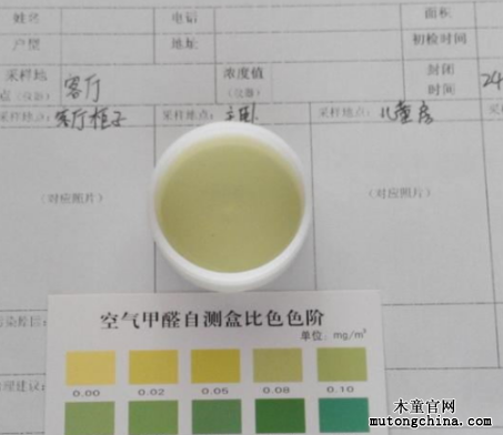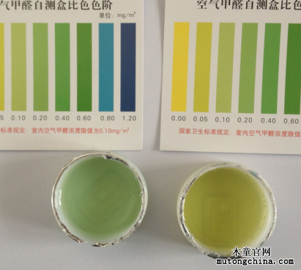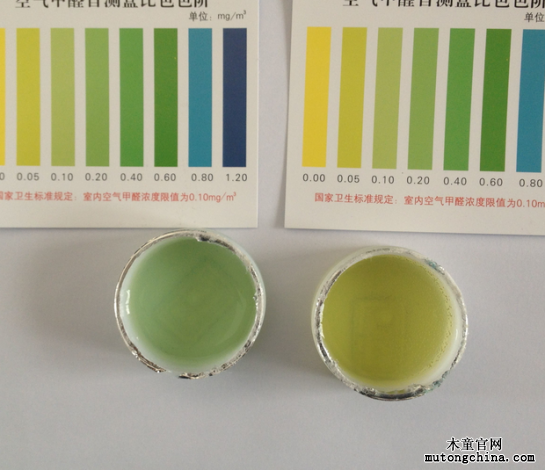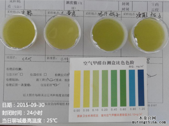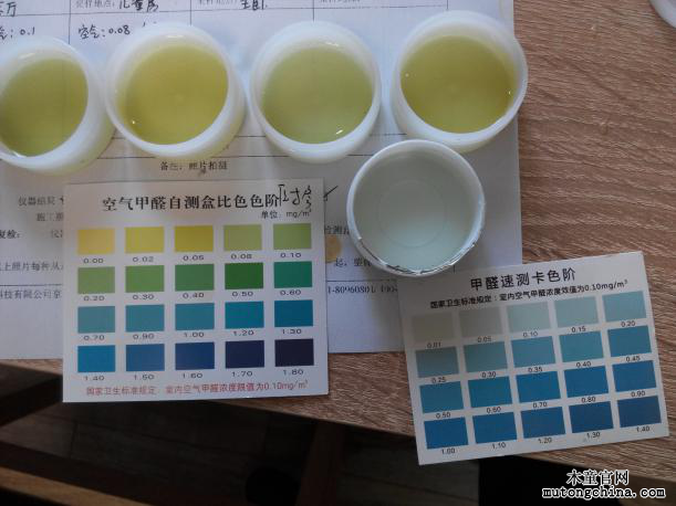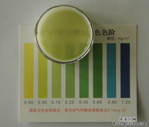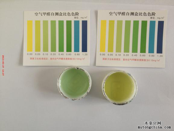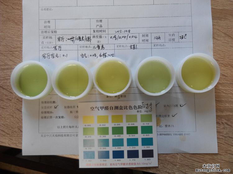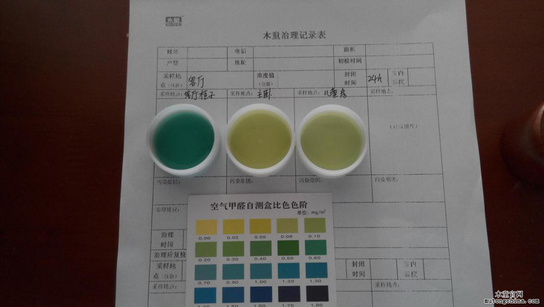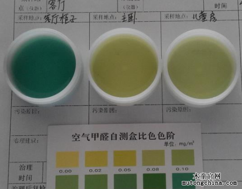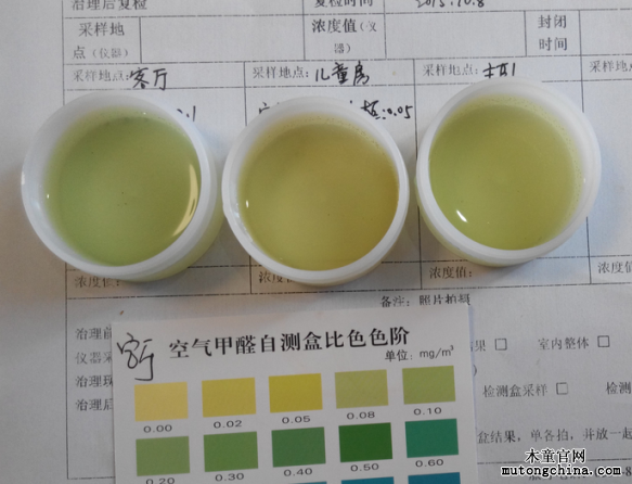 這張照片是濟(jì)南木童環(huán)保科技公司在客戶家中治理甲醛污染之前,用甲醛自測(cè)盒檢測(cè)的結(jié)果,其中藍(lán)綠色(0.8左右)的是客廳柜子里的檢測(cè)結(jié)果,中間偏黃色(0.05左右)的是主臥室空間的結(jié)果,右邊換綠色(0.1左右)的是兒童房空間的結(jié)果。