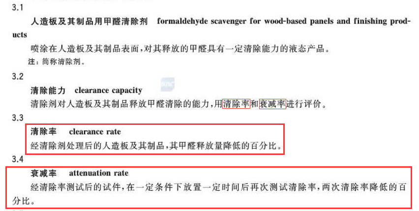 根據(jù)國家標(biāo)準(zhǔn),驗(yàn)證人造板甲醛清除劑的清除能力的有兩個(gè)指標(biāo)非常重要,一個(gè)是測定24小時(shí)效果的“甲醛清除率”,還有一個(gè)測定長期效果的“衰減率”。“衰減率”就是在7天之后,再測一次甲醛清除率,然后把7天后的甲醛清除率與24小時(shí)的甲醛清除率作比較,看前后兩次清除甲醛的效果降低了多少,計(jì)算出來的降低比率就是“衰減率”。