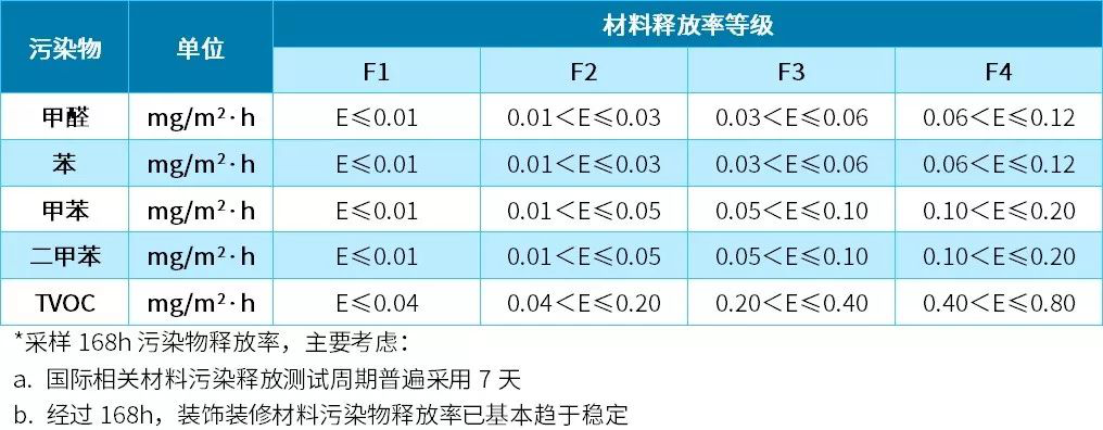 《標(biāo)準(zhǔn)》以材料和部品測試或計算所得的168小時(7天)對應(yīng)的污染釋放率作為依據(jù),將裝飾裝修材料及部品環(huán)保性能分為四個等級。采用污染物釋放率作為材料環(huán)保性能的評價,能更直觀的反映材料對空氣質(zhì)量影響,通過分級便于比較材料環(huán)保性能和有助于選擇配置材料。
