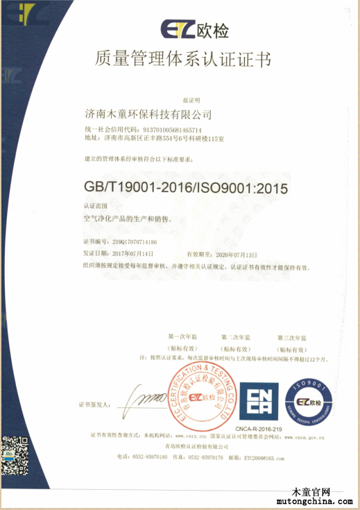 濟南木童環(huán)保科技有限公司(我北京中興天瑞科技有限公司子公司)至2015年承擔(dān)木童室內(nèi)環(huán)保產(chǎn)品的生產(chǎn)任務(wù),近日又通過國家GB/T19001-2016 / ISO9001:2015質(zhì)量管理體系認(rèn)證。標(biāo)志著木童產(chǎn)品在生產(chǎn)工藝、質(zhì)量管理、產(chǎn)品檢驗穩(wěn)定等生產(chǎn)全過程,又上了一個新臺階。