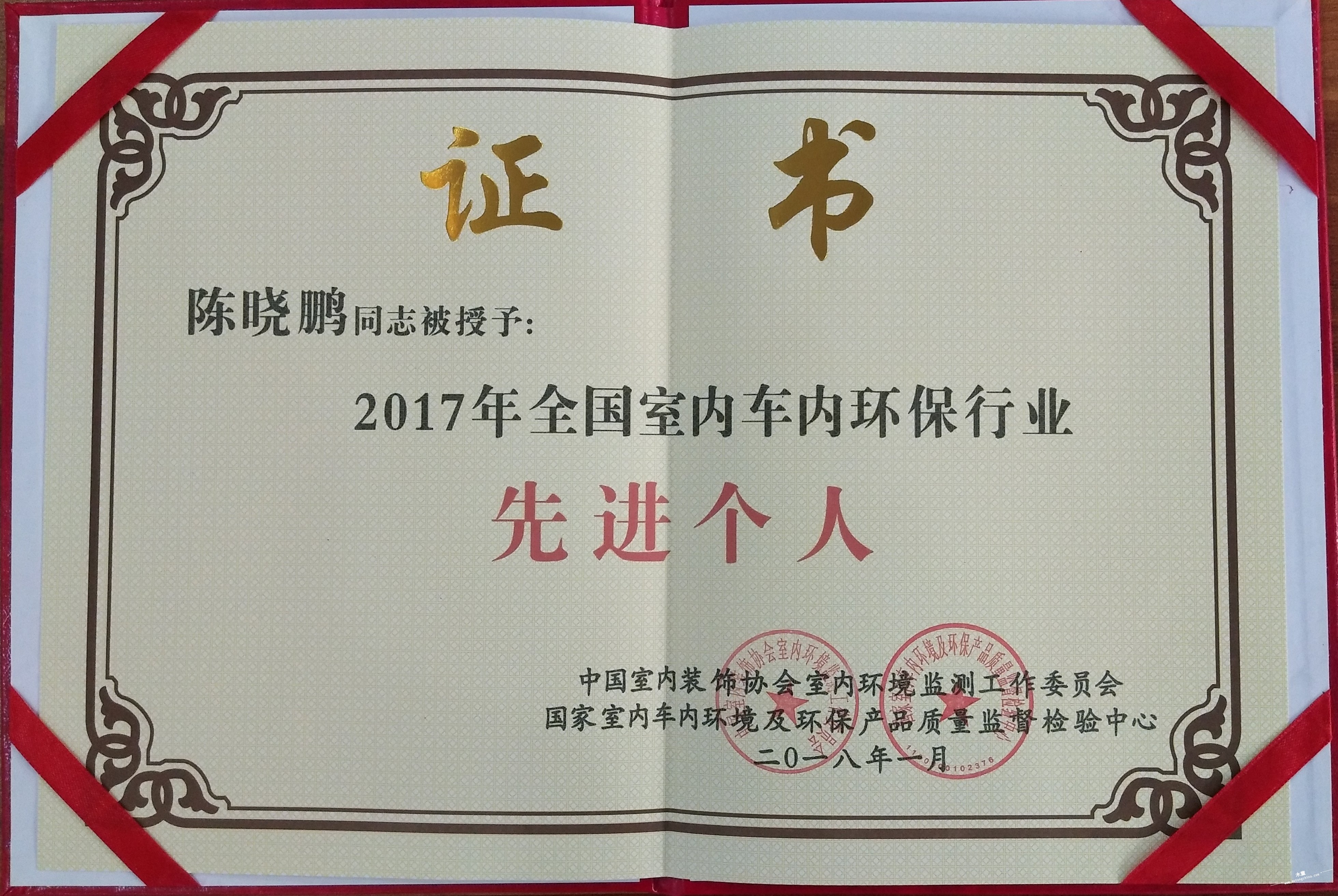 2018年1月28日,在北京維也納酒店舉行了以“新時代 新氣象 新作為”為主題的全國室內(nèi)車內(nèi)環(huán)保行業(yè)發(fā)展年會上,經(jīng)嚴格篩選甄別,中國室內(nèi)裝飾協(xié)會室內(nèi)環(huán)境監(jiān)測工作委員會、國家室內(nèi)車內(nèi)環(huán)境及環(huán)保產(chǎn)品質(zhì)量監(jiān)督檢驗中心確認,北京中興天瑞科技有限公司總經(jīng)理陳曉鵬同志被授予“2017年全國室內(nèi)車內(nèi)環(huán)保行業(yè)先進個人”的榮譽稱號。