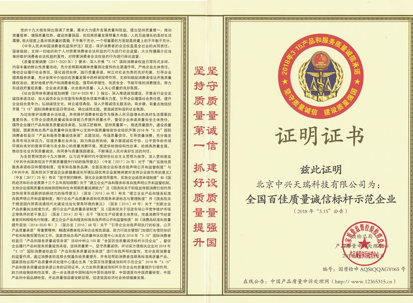 日前,在國家質(zhì)量監(jiān)督檢驗檢疫總局(以下稱國家質(zhì)檢總局)質(zhì)量申訴處理中心支持中國質(zhì)量檢驗協(xié)會組織開展2018年“3.15”國際消費者權(quán)益日“產(chǎn)品和服務(wù)質(zhì)量誠信承諾”主題活動中,質(zhì)檢總局產(chǎn)品質(zhì)量申訴處理中心從全國各行業(yè)的幾萬家企業(yè)單位中特別樹立了一百家質(zhì)量誠信標(biāo)桿示范企業(yè),我北京中興天瑞科技有限公司喜獲“全國百佳質(zhì)量誠信標(biāo)桿示范企業(yè)”之列,深感榮幸和責(zé)任重大。