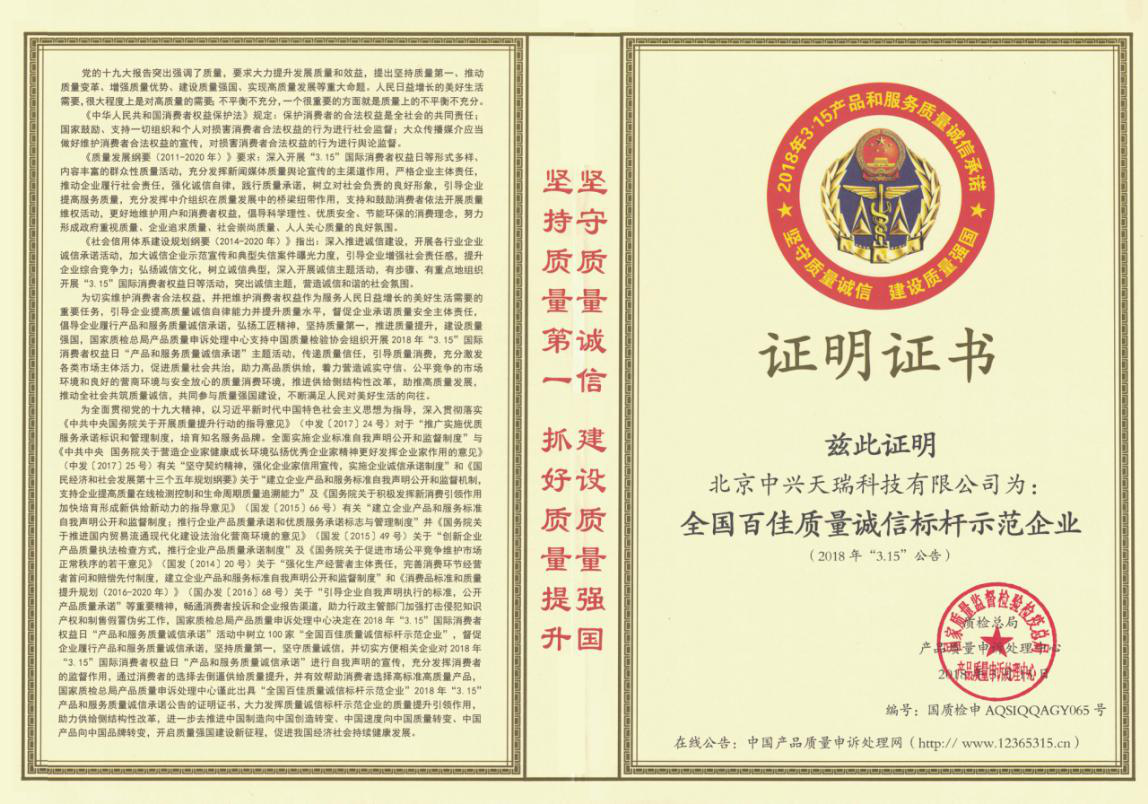 2018年榮獲國(guó)家質(zhì)量監(jiān)督檢驗(yàn)檢疫總局產(chǎn)品質(zhì)量申訴處理中心頒發(fā)的證書(shū)