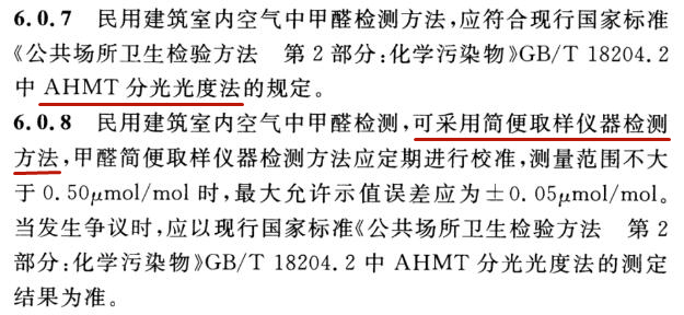 甲醛檢測允許使用經(jīng)過定期校準的便攜式檢測儀進行檢測,當發(fā)生爭議時,應以現(xiàn)行國家標準GB/T18204.2中AHMT分光光度法的測定結(jié)果為準。