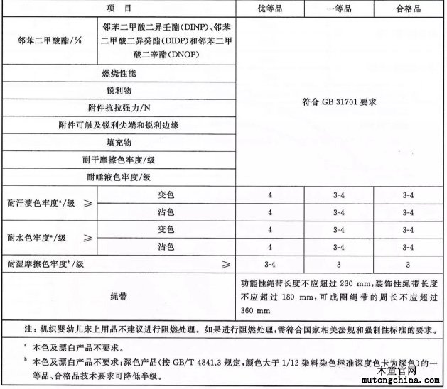 1. 安全性:嬰幼兒產(chǎn)品的安全技術指標包括甲醛含量、pH值、異味、可分解致癌芳香胺染料、重金屬、鄰苯二甲酸酯、燃燒性能、銳利物、附件抗拉強力、可觸及銳利尖端和銳利邊緣、填充物、耐摩擦色牢度、耐唾液色牢度、耐汗?jié)n色牢度、耐水色牢度、繩帶。標準中增加了產(chǎn)品不進行阻燃處理的建議,標準中優(yōu)等品的耐汗?jié)n色牢度、耐水色牢度指標比強制性國家標準提高了0.5級。