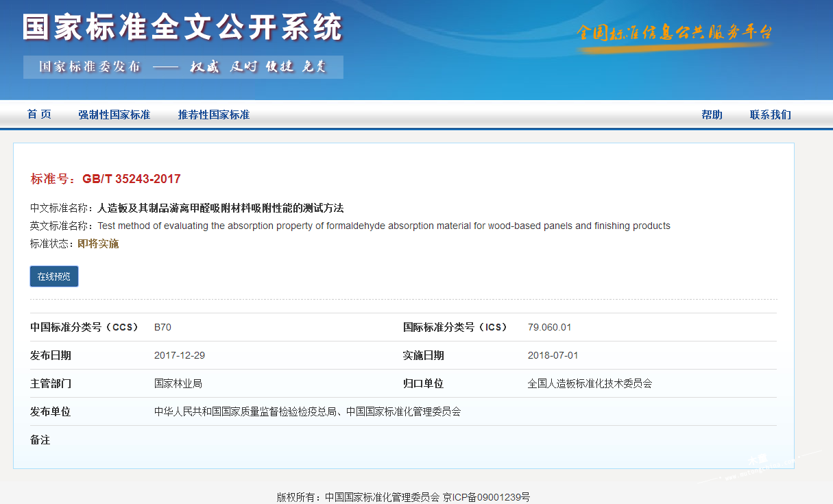 GB/T 35243--2017 《人造板及其制品游離甲醛吸附材料吸附性能的測(cè)試方法》于2018年7月1日起正式實(shí)施。
