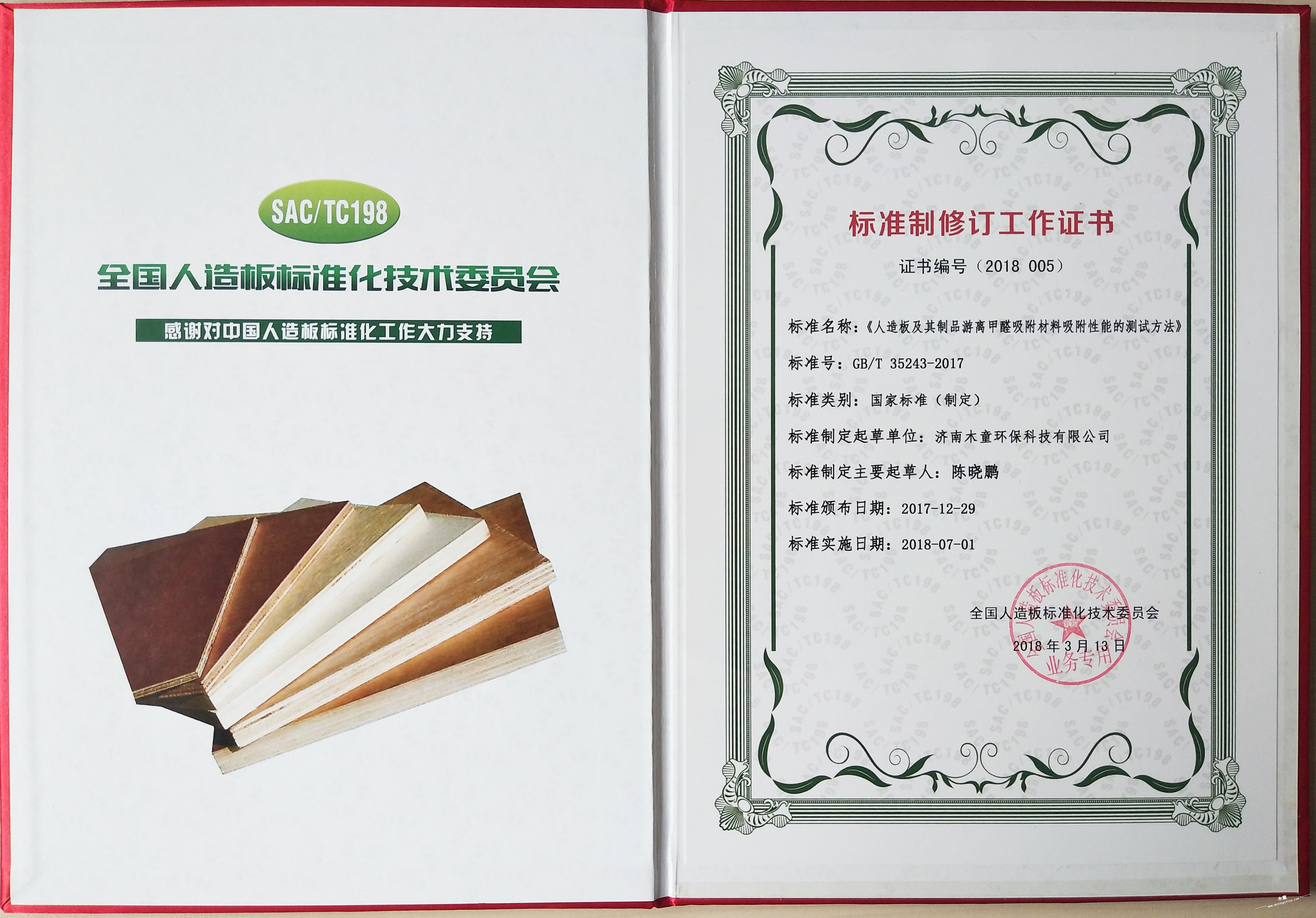 重要喜訊通告,由我子公司——濟(jì)南木童環(huán)??萍加邢薰?/strong>與上海木材工業(yè)研究所、上海計(jì)量測(cè)試技術(shù)研究院、東莞宇潔新材料有限公司、廈門格靈生物技術(shù)有限公司、南京林業(yè)大學(xué)、巴洛克木業(yè)、福人集團(tuán)、耀東華家具板材公司等單位主編起草的《人造板及其制品游離甲醛吸附材料吸附性能的測(cè)試方法》國(guó)家標(biāo)準(zhǔn)(GB/T35243—2017),已正式公布,于今年7月1日正式執(zhí)行。