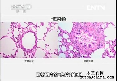 他們?cè)俅螌?duì)兩組小鼠進(jìn)行了針對(duì)呼吸系統(tǒng)的實(shí)驗(yàn),進(jìn)一步揭示甲醛的危害。當(dāng)小白鼠長(zhǎng)期呼吸混有高濃度甲醛的空氣時(shí),會(huì)使呼吸系統(tǒng)產(chǎn)生病變。通過下圖可以看出,染毒小鼠的器官內(nèi)部由炎癥引發(fā)了水腫現(xiàn)象,從而導(dǎo)致呼吸道狹窄。如果這種情況發(fā)生在人身上,我們的身體也會(huì)受到同樣的傷害。