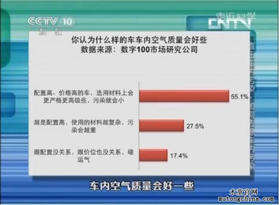 關(guān)于“你認(rèn)為什么樣的車車內(nèi)空氣質(zhì)量會好一些”的調(diào)查顯示(如上圖):55%的人認(rèn)為,配置高、價格高的車,污染就會小。這樣的“認(rèn)為”是否正確呢?