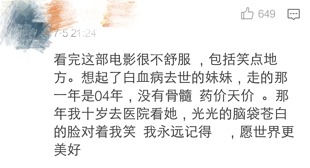 “人至中年,好容易有點些積蓄,有房有車,卻因為生病一夜返貧,整個家庭窮困潦倒。”在這部電影里悲劇的背后,提醒我們健康的重要性,如果你足夠重視自己的生活,如果你更加用心的對待自己的生活,也許這一幕幕都不會發(fā)生到我們的現(xiàn)實中……對生病的人來說,他們需要花錢買藥來救命。有錢才要藥,有藥才能有命。對他們來說,“命就是錢”。 一名湖南慢粒病人去省委請求將格列衛(wèi)加入醫(yī)保的時候這樣說道:“有病沒有藥是天災,有藥買不起是人禍。”