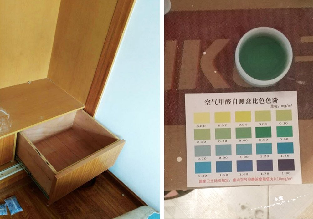 濟(jì)南業(yè)主楊女士為了孩子上學(xué)買了學(xué)區(qū)房,因?yàn)槭嵌址?,之前房主裝修時制作的家具雖然已經(jīng)7、8年了,但都基本完好,可以使用,加之又不常住,也就沒有拆除,只是新添置了沙發(fā)、茶幾等小件家具。因?yàn)閹Ш⒆优紶栆矔滋?,楊女士從天貓木童旗艦店購買了甲醛自測盒,又咨詢了客服,在客服的指導(dǎo)下,不僅測了室內(nèi)空氣中的甲醛,還測了每件家具內(nèi)的甲醛。