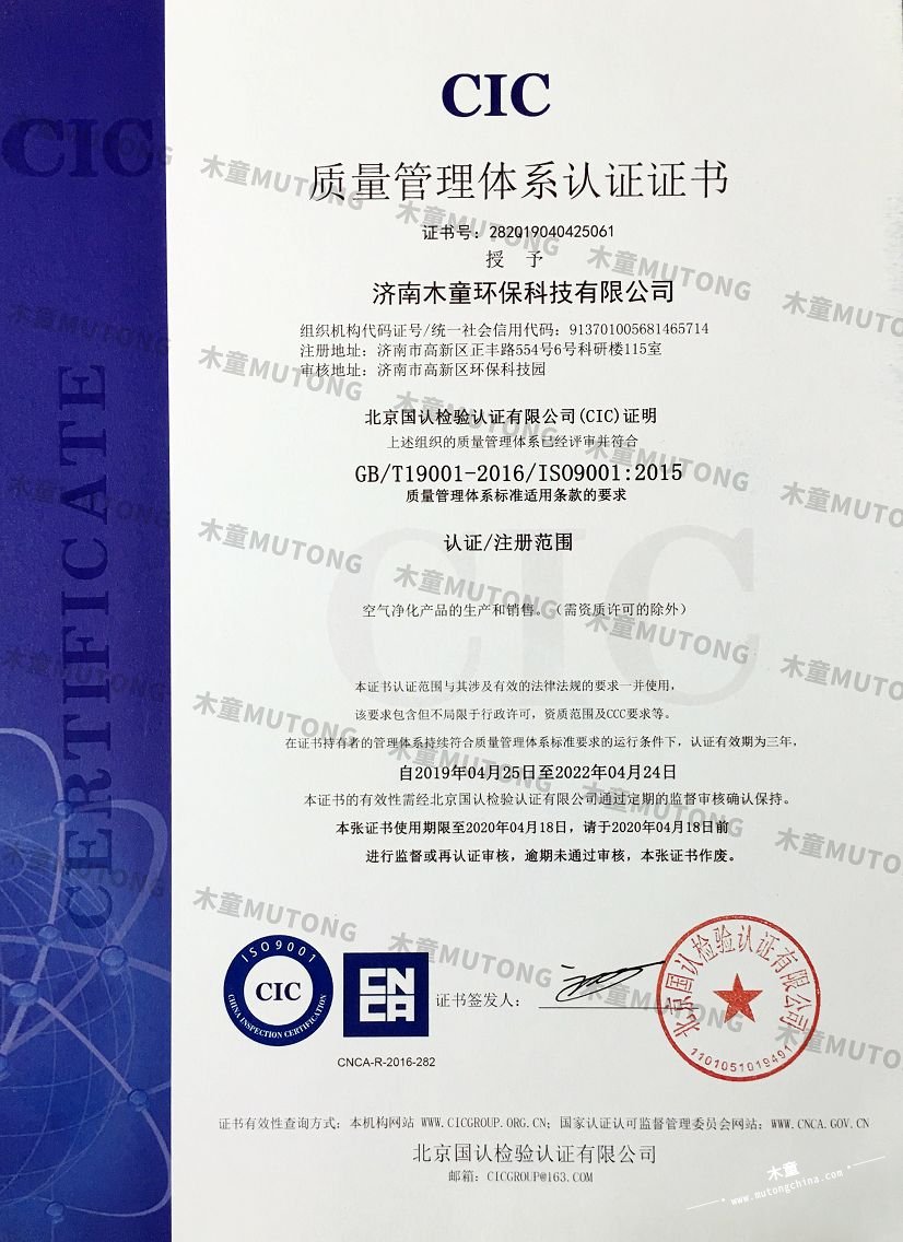 木童榮獲2019年ISO9001質(zhì)量管理體系認證
