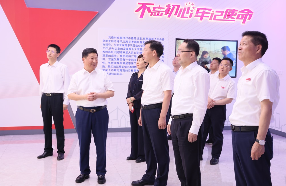 Secretary Liu Jun and his delegation visited the Double Star New Materials Exhibition Hall to gain a detailed understanding of the core key technologies, processes and equipment, production processes, and product capacity in the field of new materials. They carefully listened to Chairman Wu Peifu's introduction to the development plans of Double Star New Materials, including scientific research and innovation, industrial layout, and global operations. They affirmed Double Star New Materials' adherence to industry, independent innovation, and continuous progress, breakthroughs, and new achievements in the high-quality development of the enterprise. He encouraged enterprises to further promote the deep integration of industrial chain, innovation chain and talent chain, strengthen scientific and technological research and innovation breakthrough, and contribute more private enterprises to the new practice of Chinese path to modernization in Jiangsu.