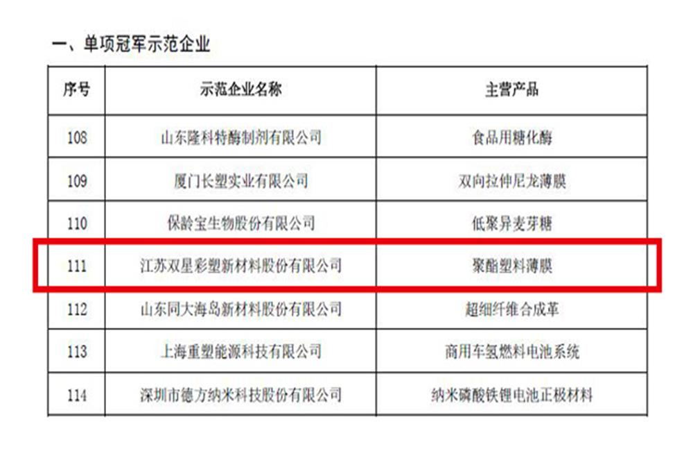 近日,工業和信息化部、中國工業經濟聯合會公示了第六批國家級制造業單項冠軍示范企業名單,江蘇雙星彩塑新材料股份有限公司憑借聚酯薄膜產品的引領優勢和技術創新優勢,入選“國家制造業單項冠軍示范企業”榜單。制造業單項冠軍是指長期專注并深耕于產業鏈某些特定細分產品市場,在所在領域占有較高市場份額,產品市場占有率位居全球前3位,生產技術或工藝國際領先,創新能力強、質量效益高的企業,發揮著明顯的示范帶動作用。