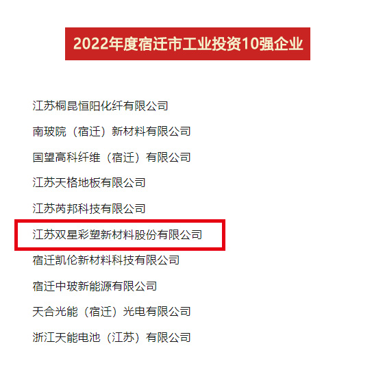 2023年4月7日,全市開發區高質量發展暨工業經濟年度表彰大會召開,公布了2022年度“宿遷市工業貢獻10強、工業投資10強、工業銷售10強”名單,雙星新材喜獲“貢獻10強位列第4位、投資10強位列第6位、銷售10強位列第8位”。